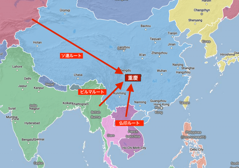 ビルマルート・フランス領インドシナルート・ソ連ルートを地図で表すとこんな感じになります。
