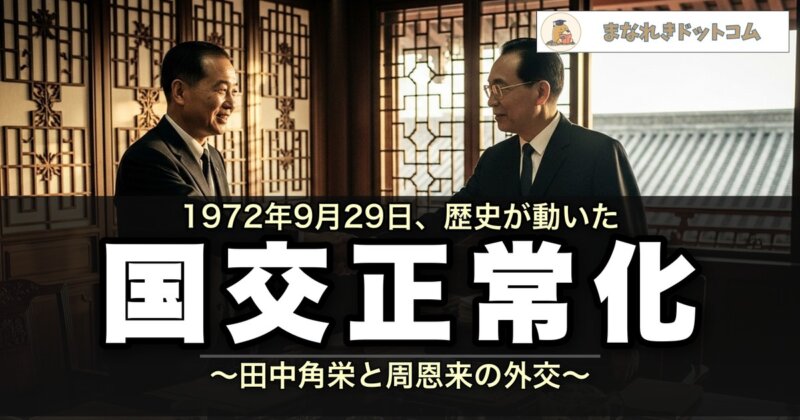 日本と中華人民共和国が正式に国交を樹立したことを指します。1972年9月29日、田中角栄首相と周恩来首相が日中共同声明に調印し、戦後27年間にわたって続いた国交のない状態が解消されました。「正常化」という言葉が使われるのは、「正式な国交がない状態を正常に戻す」という意味合いがあるためです(日本は1945年以前は中華民国と国交があったものの、中華人民共和国とは建国(1949年)以来一度も国交を結んでいませんでした)。