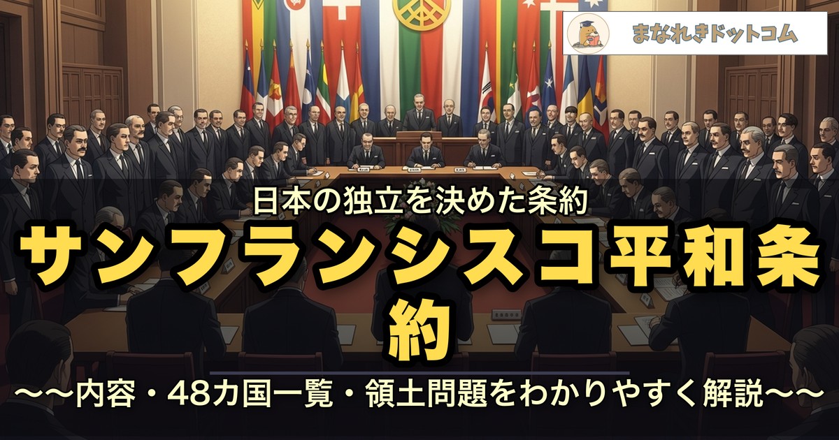 サンフランシスコ平和条約とは、1951年9月8日にアメリカのサンフランシスコで、連合国48カ国と日本の間で結ばれた講和条約のことです。正式名称は「日本国との平和条約」で、サンフランシスコ講和条約とも呼ばれます。
