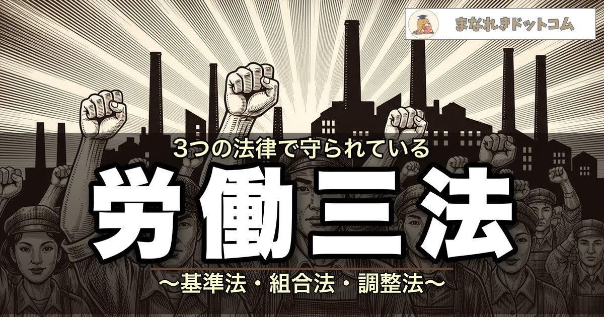 • 労働三法とは、労働基準法・労働組合法・労働関係調整法の3つの法律のこと